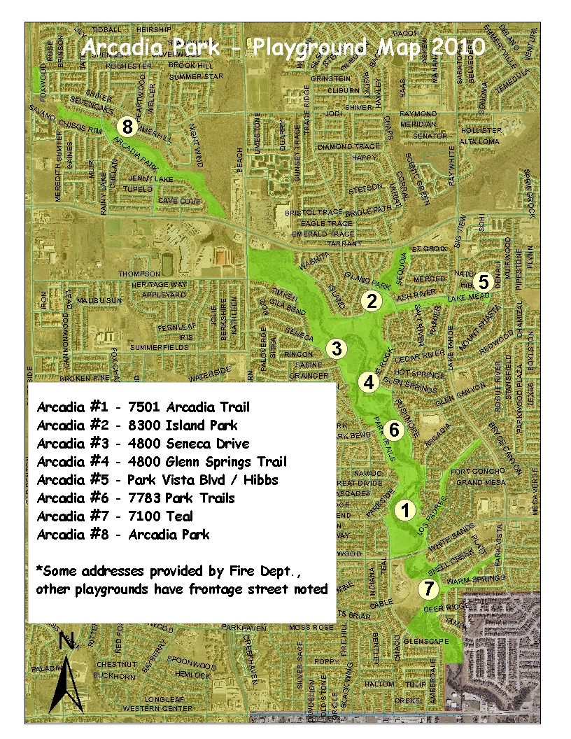 The Arcadia Park is divided into 8 areas, primarily for ease of reference. Certain park entrances have a kiosk that shows the park layout, including the trails, creeks, ponds, playgrounds, doggie stations and surrounding streets: