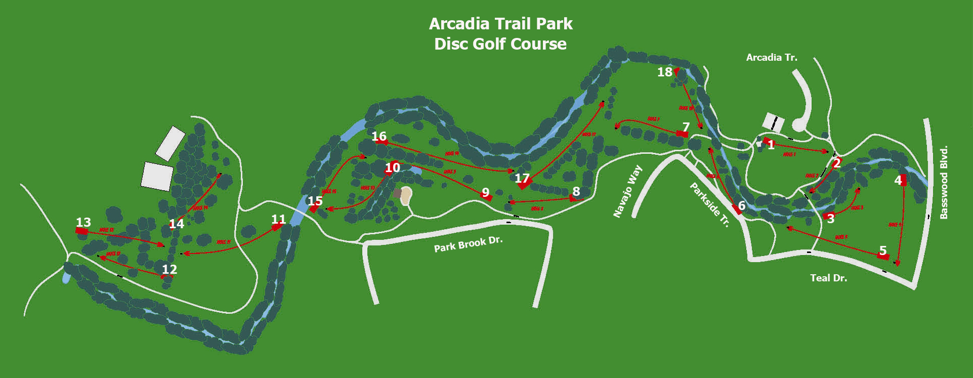 The disc golf course is located in Arcadia #1. Hole #1 is at the Arcadia Court entrance. Read a review of disc golf course, including photos of each tee.